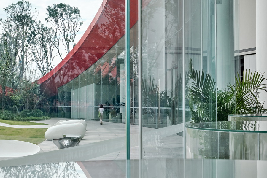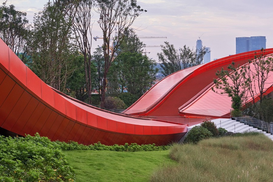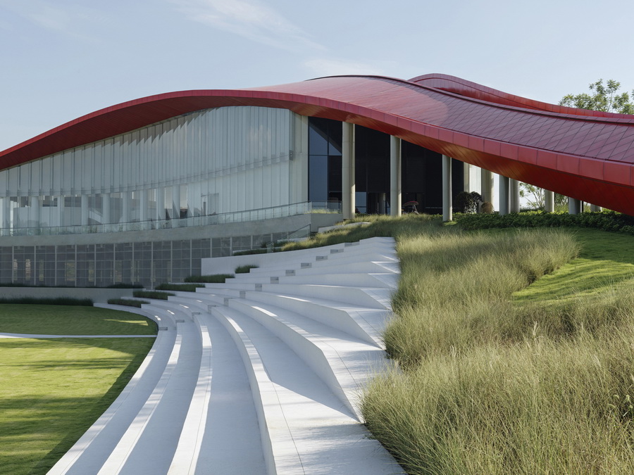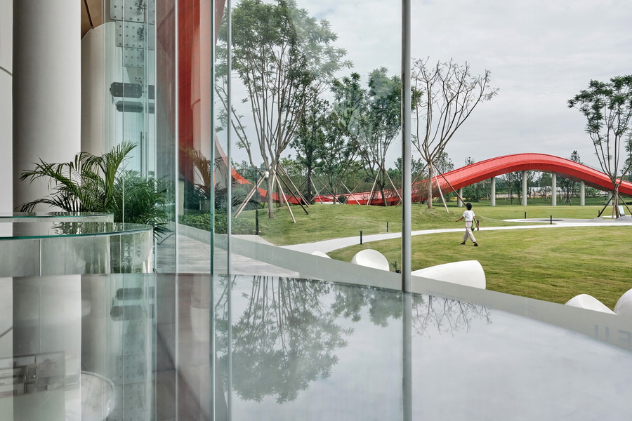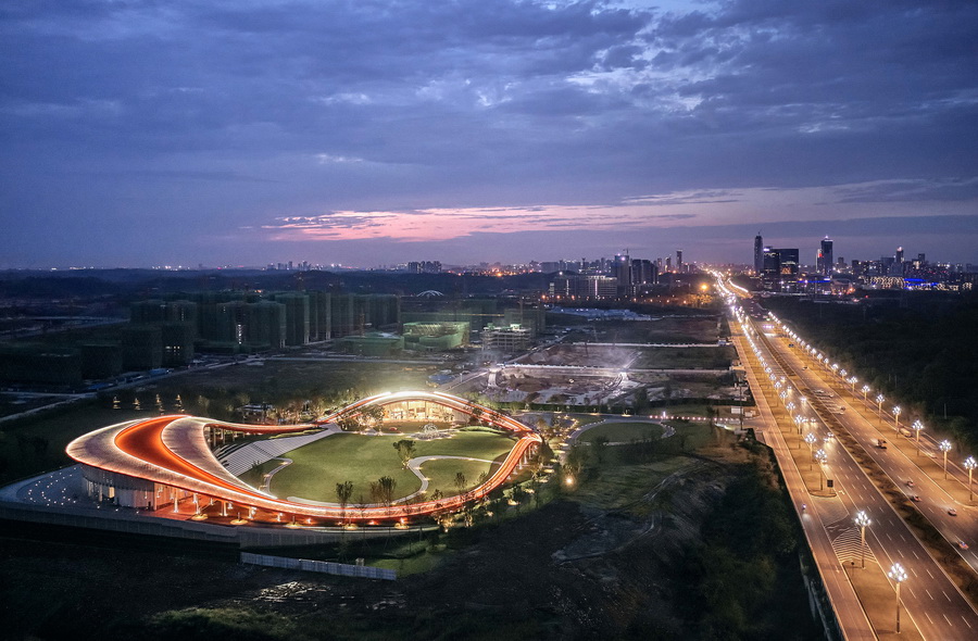 紫光.天府芯城位于四川成都天府新区,是天府大道沿线涌现的几个重点开发项目之一。“智慧之环”(Loop)就位于天府大道这条城市主动脉旁,以其流动的形式和鲜艳的红色引起人们的注意。在夜晚,LED照明系统会将其转变成一座发光的雕塑。作为新开发项目中第一座完工的建筑,它已成为未来社区的象征性地标,并吸引着未来的居民入住。