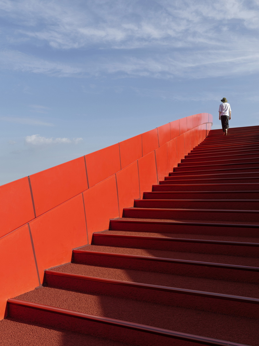 屋顶步道总长698米,从地面上升可达25米高,在屋顶上可欣赏到周围的绿地和遥远山脉的壮丽景色。它的表面是塑胶跑道(用于田径运动的材料),使之非常适合跑步者和步行者。选择红色作为屋顶的颜色是因为它与景观中郁郁葱葱的绿色形成鲜明的对比。