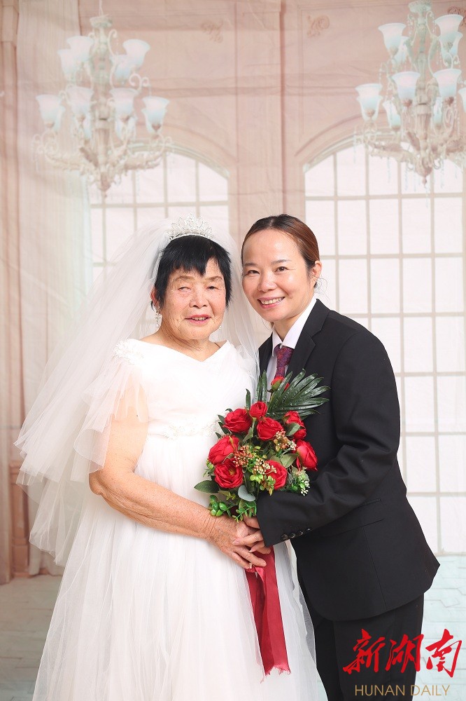 “当时父母结婚也没有像样的仪式,因为活动明确要夫妻两人到场才可以拍摄,可父亲已去世多年,抱着试试看的心态询问了工作人员,可不可以由我代替父亲陪母亲拍照,没想到同意了。”周喜荣常年在惠州工作,这次也是特意赶回来圆母亲的婚纱梦,虽然活动方免费提供化妆和服装,但贴心的女儿还是在出发前为老母亲换上了新买的衣服。