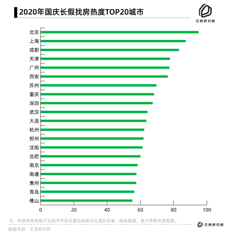 贝壳研究院对十一假期(10月1日-7日)平台带看数据统计显示,北京“总带看量”突破了5万次,同比去年2.96万次增幅明显,位居城市排行榜第一名;上海与成都以4.2万次和3.7万次分列二三名。
