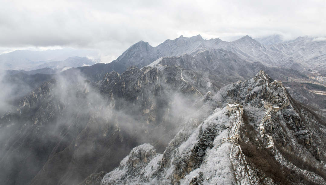 2020年11月19日,北京部分地区降下入冬后第一场雪。箭扣长城在雪后白茫茫一片,云海翻腾,放眼望去,犹如一幅水墨画。(来源:视觉中国)