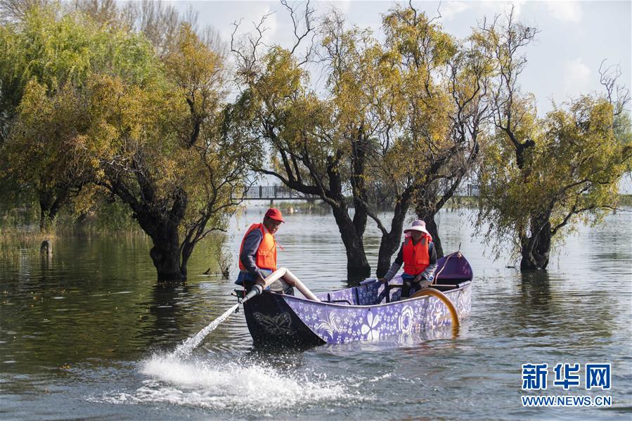 11月9日,两名工作人员在洱海古生村水域驾船进行控藻作业。新华社发(陈欣波 摄)