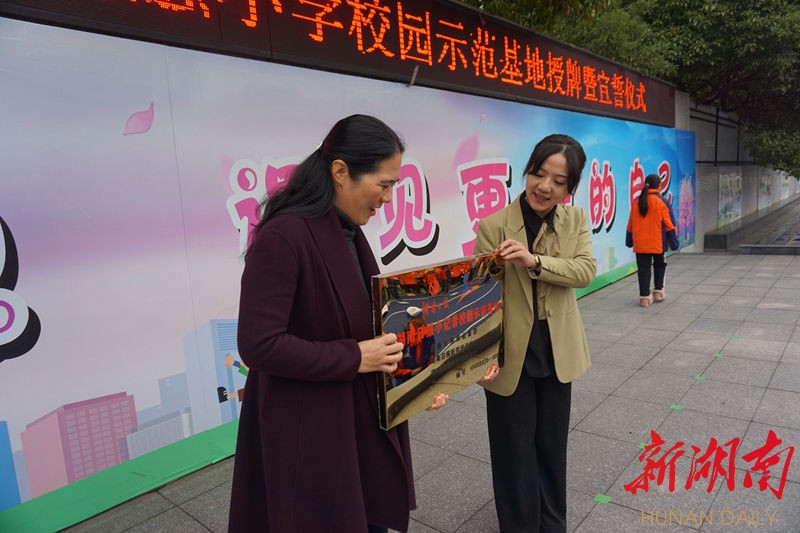 全校三千多名师生齐聚操场,湖南日报小记者们身着装备,整齐地站在最前方。当湖南日报小记者衡阳组委会相关负责人向祝融小学党支部书记邝勇秀授予“湖南日报小记者校园示范基地”金色牌匾时,全场爆发出热烈的掌声。随后,69名湖南日报小记者郑重宣誓:“我是新时代的阳光少年,将秉持持续向上的力量奋斗……”