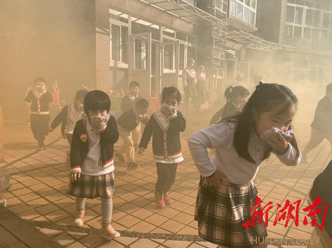 随着幼儿园内烟雾四起,警报拉响,全体师幼立即行动,教师组织幼儿们用湿毛巾捂住口、鼻,低头、弯腰,按疏散路线迅速有序的撤离到幼儿园操场的空旷地带。