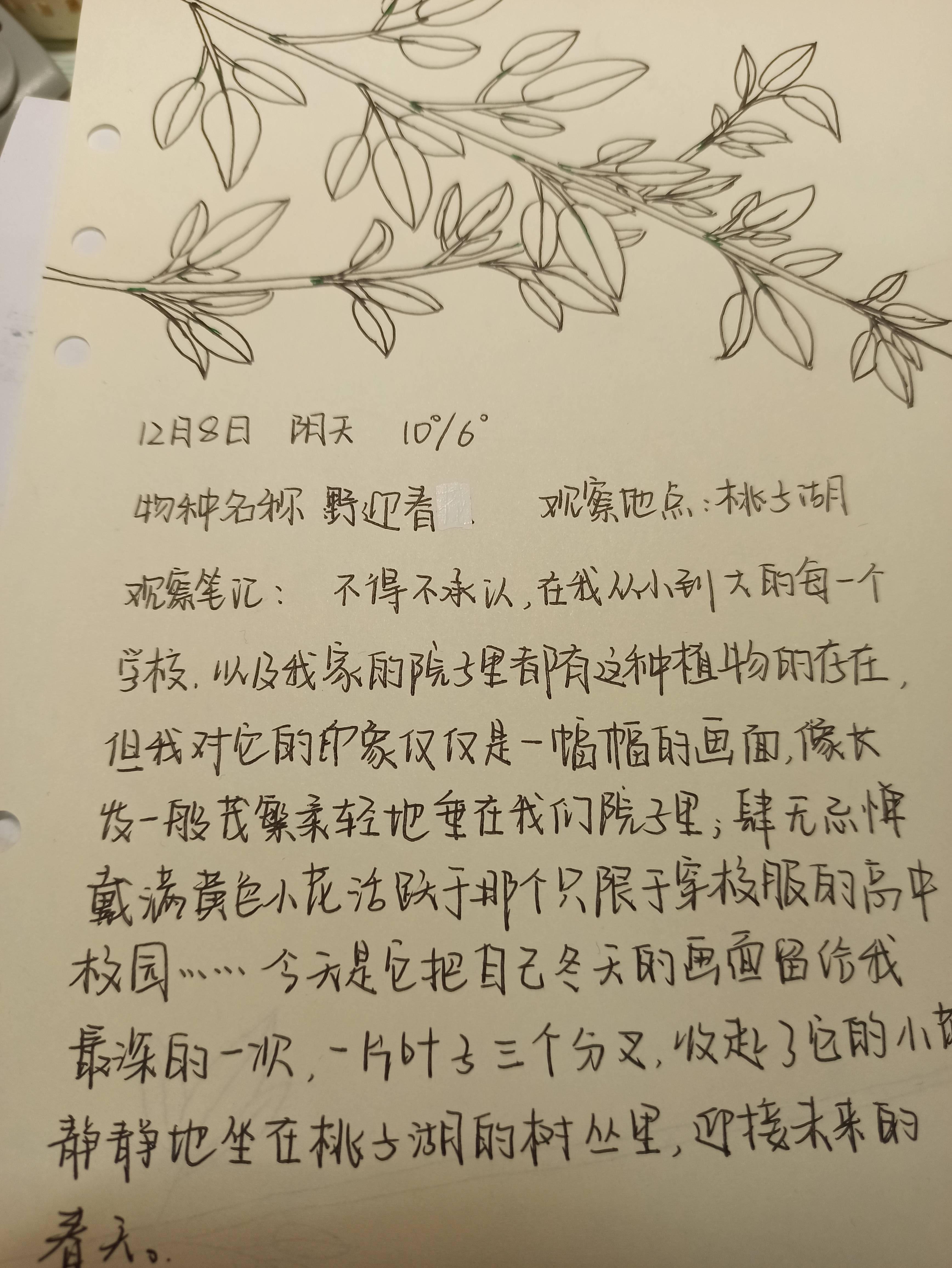 观察笔记:一片叶子上有三片复叶,对称分布。叶子不如春天那般柔软翠绿,墨绿色的叶子上带着一些黄斑。
