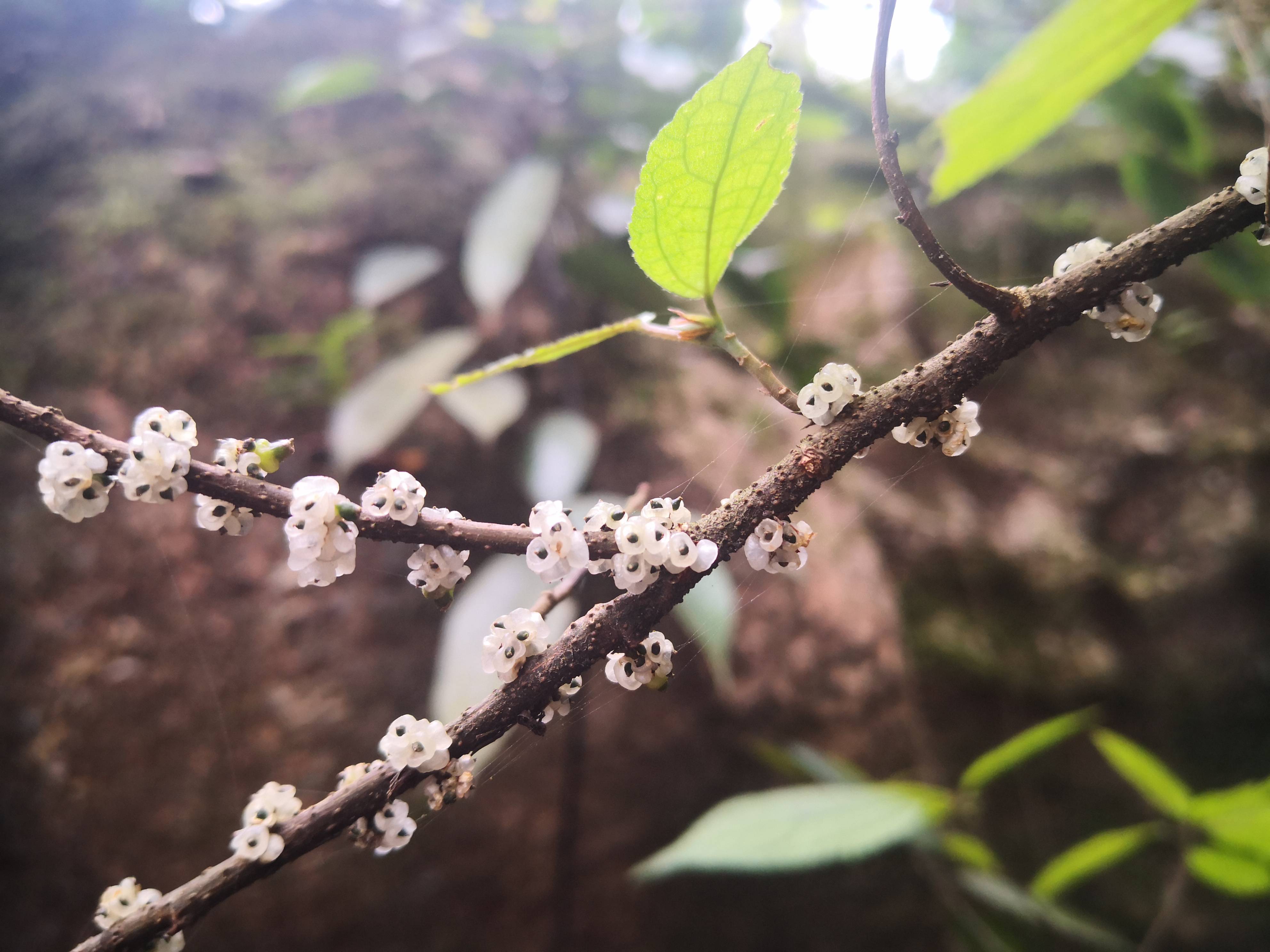 观察笔记:在将近五亿年的石林间穿行,合抱犹不及的古树到处都是,晶莹剔透的某物在眼前一晃而过,定睛一看,紫苎麻的果实紧紧挨着,挤在树枝上,以为软软的呢,用手去摸,结果要用力才能掰下来一小坨(此动作非友好示范,请勿模仿)……黑黑的小点是它的种子,在这纯粹的白之中,更显得可爱而珍贵!