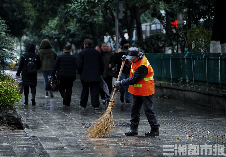 (12月29日,今年入冬以来最强冷空气来袭,长沙街头进入“速冻”模式。气温虽跌破零度,交警、环卫、路政、志愿者等工作人员仍在坚守岗位。 本组图片由记者 顾荣 摄)