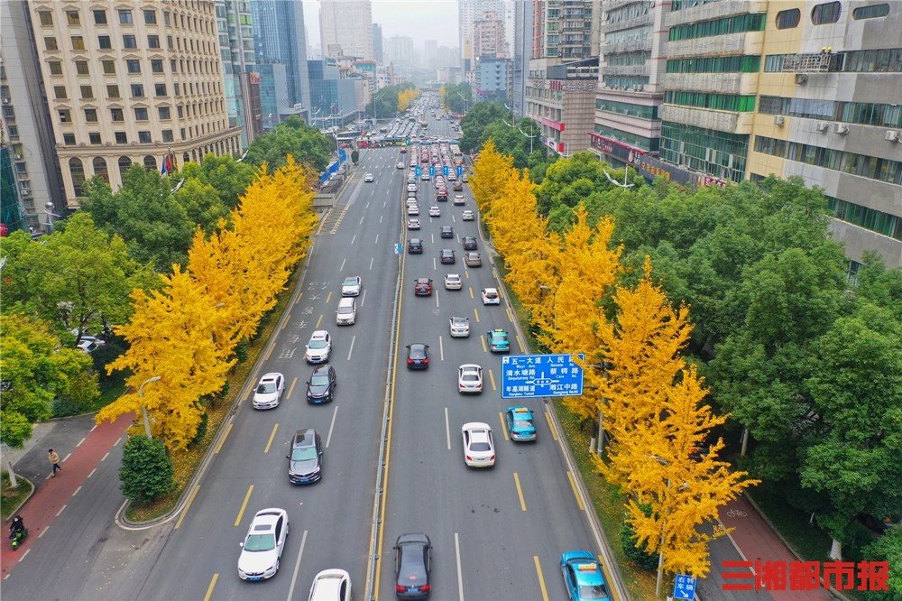 12月7日,长沙市芙蓉路两旁的银杏黄了,如一株株身披黄金甲的骑士,和旁边葱绿的香樟树,一黄一绿,一浅一深构成了美轮美奂、如诗如画的诗意世界。(记者 顾荣 摄影报道)