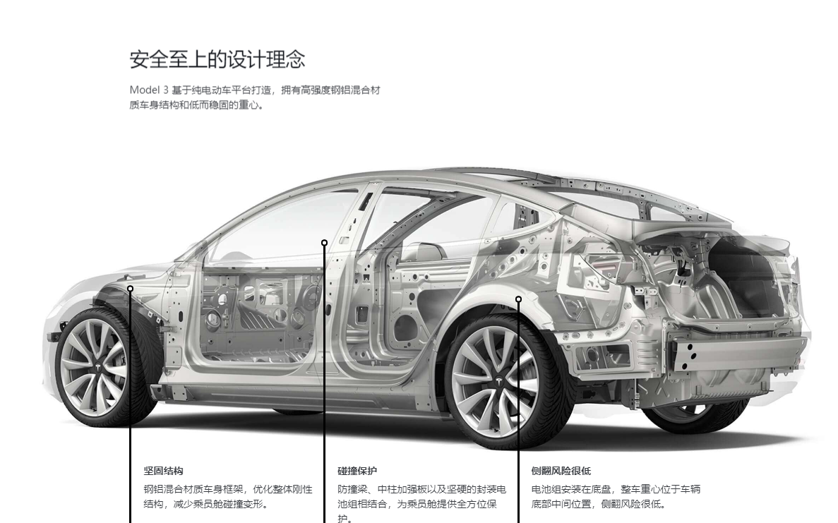 与此同时,特斯拉对车辆的被动安全方面也格外重视。以Model 3为例, Model 3车身采用钢铝混合材质车身框架,关键部位也使用了硼钢进行加固,可承受更大撞击力。此外,将电池组布置在车身底部的创新设计,也大幅提升Model 3的整体结构强度,降低侧翻和侧面碰撞被侵入的风险。特斯拉表示,这并不是为了装下更大电池的“无心插柳”设计,而是为了安全而选择的最佳方案。