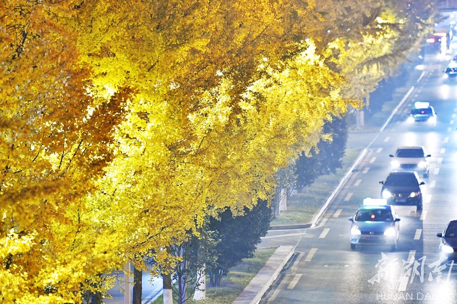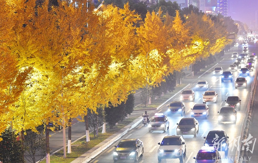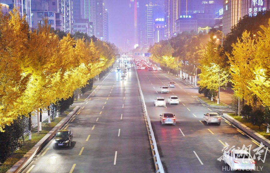 12月8日晚,长沙市芙蓉中路,道路两旁金黄的银杏树在路灯映射下显得格外漂亮。湖南日报记者 童迪 摄