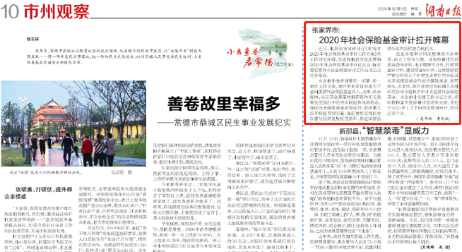 张家界市审计局高度重视本次审计,成立了领导小组。并由市审计局财政金融审计科、电子数据审计科、行政事业审计科、建设资金审计科、自然资源资产审计科等五个科室负责审计市本级基本养老保险基金和医疗保险基金,市局牵头,永定区、慈利县审计局抽调人员组织联合审计组负责审计本区县社会保险基金。本次审计创新工作方式方法,将积极探索大数据审计思路和方法,计划于2021年1月下旬结束现场审计,历时近两个月。(惠华玲 李智斌)