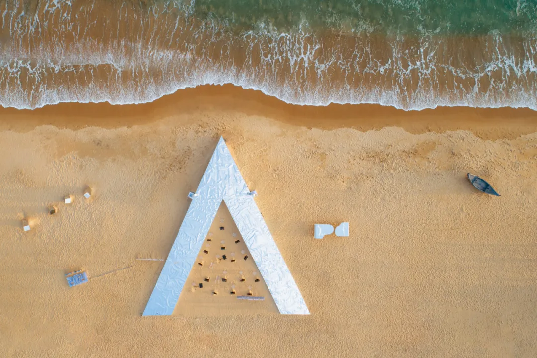 搭了一个背靠大海的极简V字型舞台,像即将起航的船舰,也像“胜利”的手势。