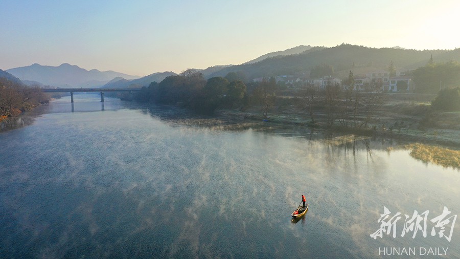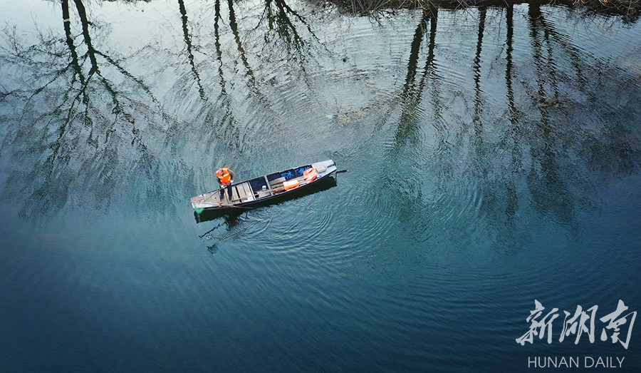 1月18日清晨,浏阳河浏阳市双江口段,保洁员罗世桃正在河面上清理垃圾。2019年,浏阳市全面启动渔民退捕工作,老渔民罗世桃开始加入河道保洁的队伍,每天从早到负责浏阳河双江口段的保洁工作。彭红霞 摄