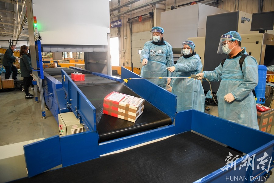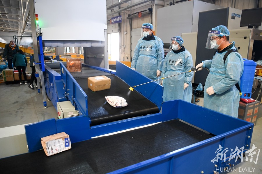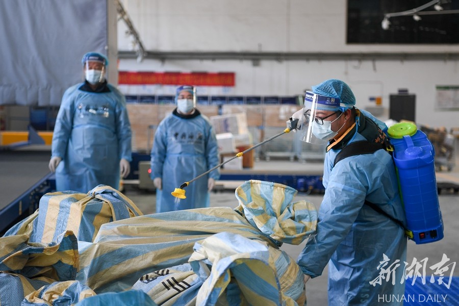 1月15日,长沙国际邮件快件监管中心,长沙邮局海关工作人员在对国际快件进行消毒。为加强进口高风险非冷链集装箱货物检测和预防性消毒工作,长沙邮局海关对所有国际邮件国际快件进行全面消毒,确保人民群众健康安全。 湖南日报·新湖南客户端记者 傅聪 摄