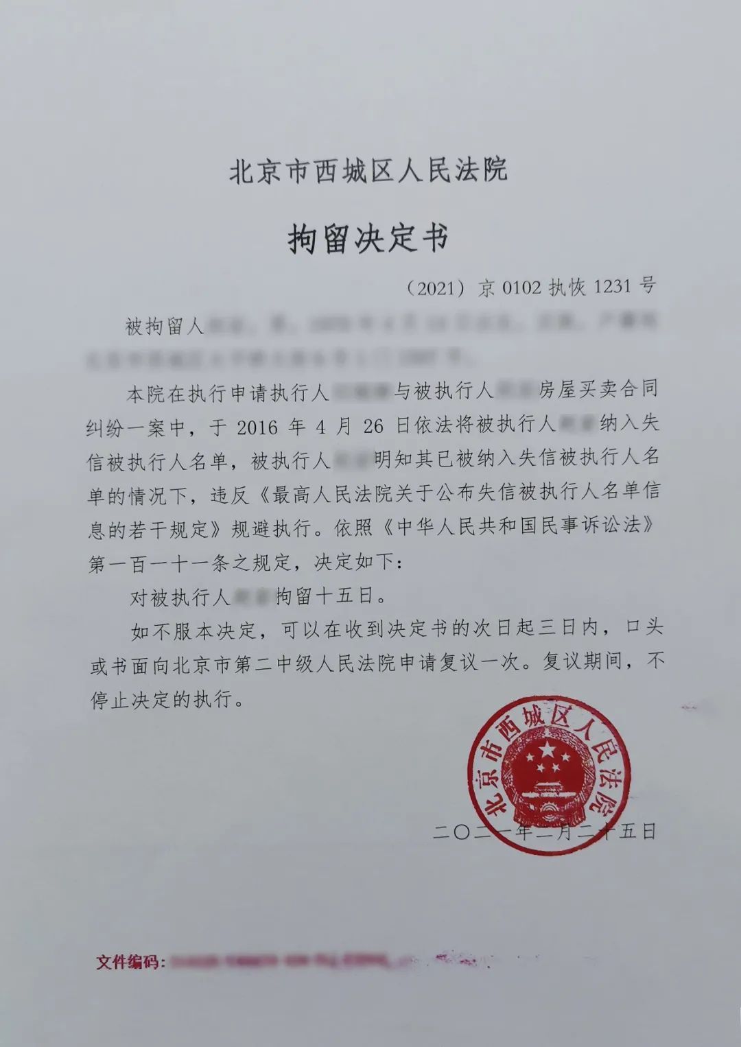 2月25日,西城法院依法对通过非法途径购买高铁票的失信被执行人赵某采取司法拘留措施。