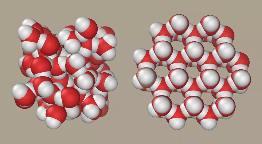 冰就是固态的水,这个大家都知道。而对于大多数物质而言,固相比液相的分子结构更加致密,但是冰却不一样,当温度降到0℃时,水会开始结冰,这时原本连接水分子的特殊氢键会在水分子之间形成额外的空间,这也是冰山为什么会漂浮在海洋中的原因。