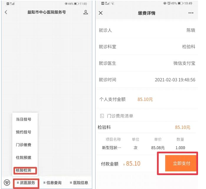 3.选择“就医服务”中的 “核酸检测”菜单,支付相关费用。