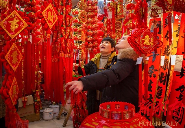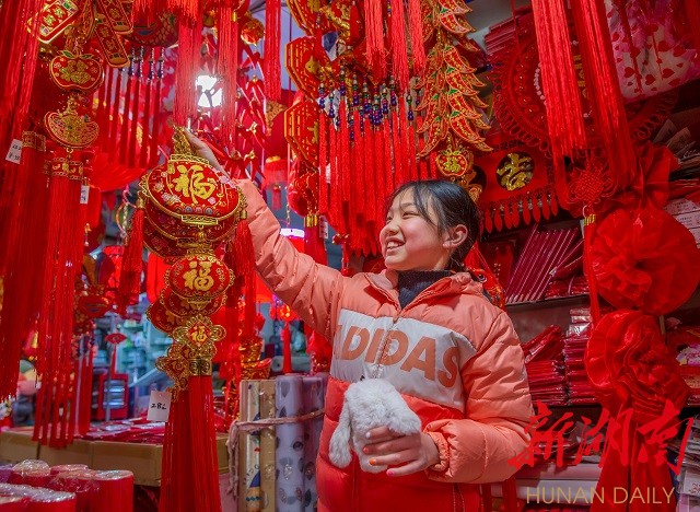 小姑娘选中福字挂联。陈烨2月4日拍于娄底九龙商厦