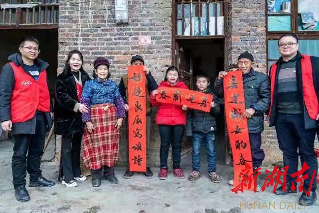 共青团涟源市委副书记谭志君带领志愿者将春联送到龙塘乡新石村村民家中。龙尔方2月5日拍于龙塘乡新石桥村