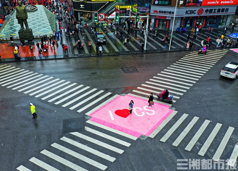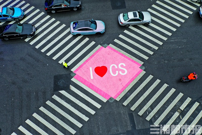 “我看着斑马线变成粉红色了!”3月7日晚上,有网友在微博、朋友圈发出长沙司门口有工人在给斑马线施工的消息,今早,更多人发现司门口这个路口三个方向斑马线都成了粉白相间,点缀着红色的爱心,而在对角斑马线的交会点,是“I+爱心+CS”的字样。