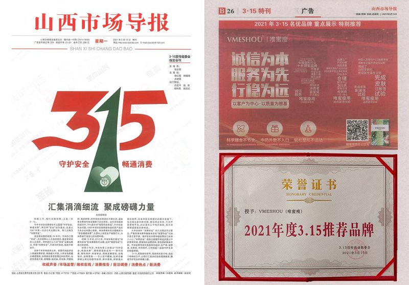 △VMESHOU(唯蜜瘦)荣获山西省“3·15推荐品牌”