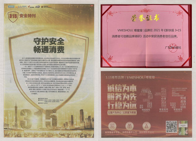 △VMESHOU(唯蜜瘦)荣获《新快报》“3.15消费者信任品牌”
