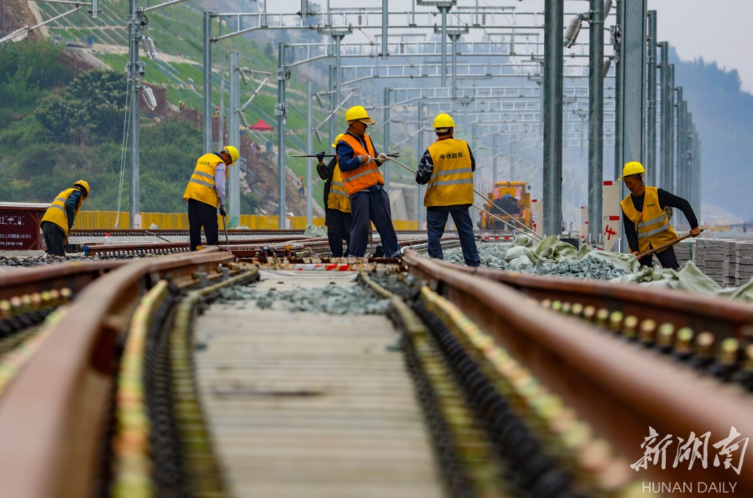 3月30日,张吉怀铁路吉首段,铁路工人在进行铺轨施工。张吉怀铁路全长246.6公里,设计速度350千米/小时,2016年底开工建设,目前进入全线轨道铺设阶段,预计4月底完成铺轨,7月1日开始联调联试。姚方 摄