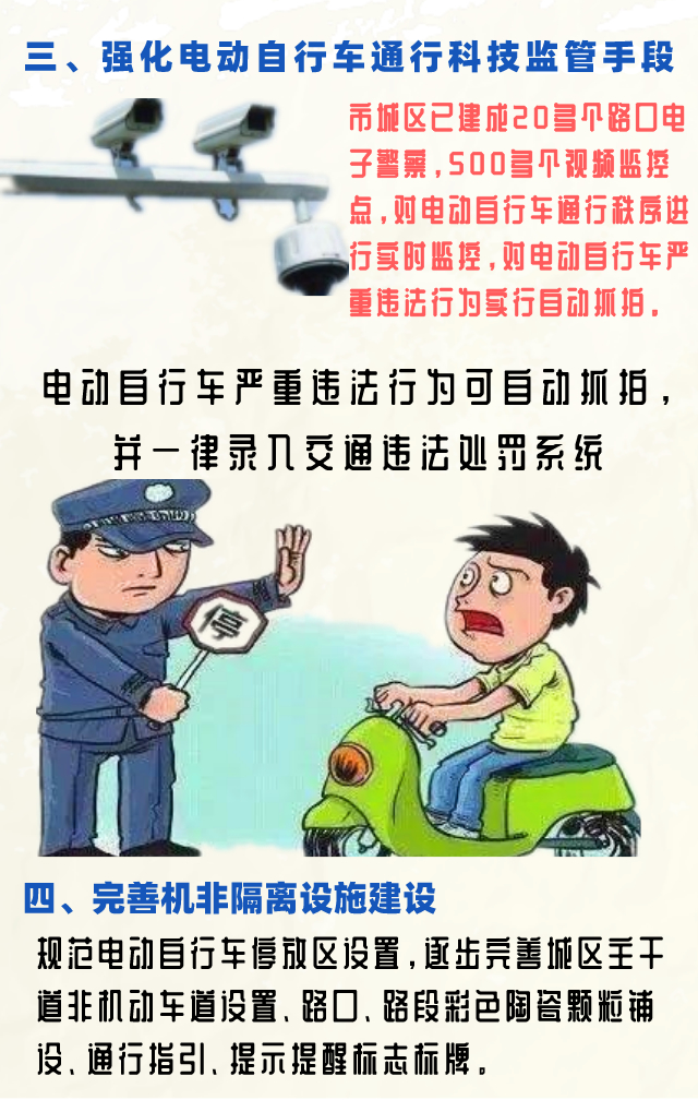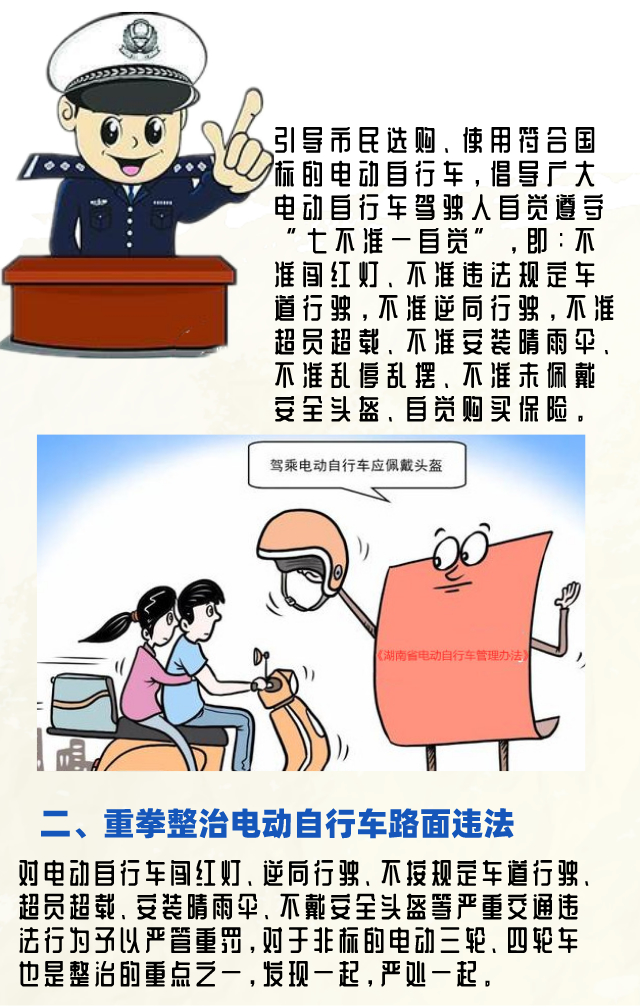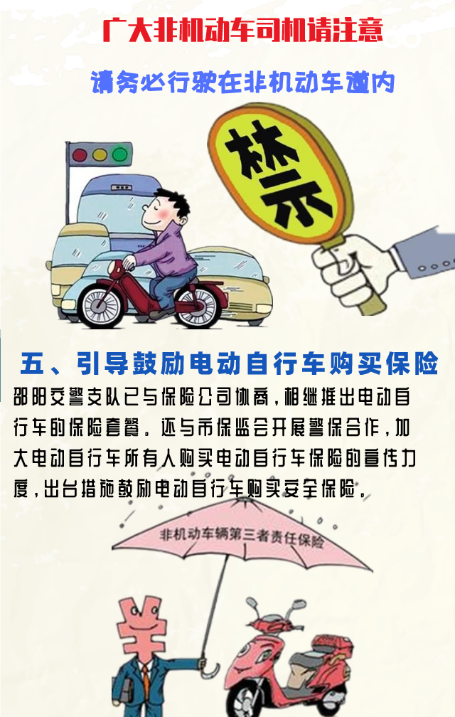 记者从会议了解到,结合交通问题顽瘴痼疾集中整治行动,从3月1日开始,邵阳交警将以《办法》为指引,在全市开展电动自行车通行秩序规范管理专项整治行动,深入开展宣传警示教育、重拳整治电动自行车路面违法、强化电动自行车通行科技监管手段、完善机非隔离设施建设、引导鼓励电动自行车购买保险、加强重点行业管理6个方面工作。