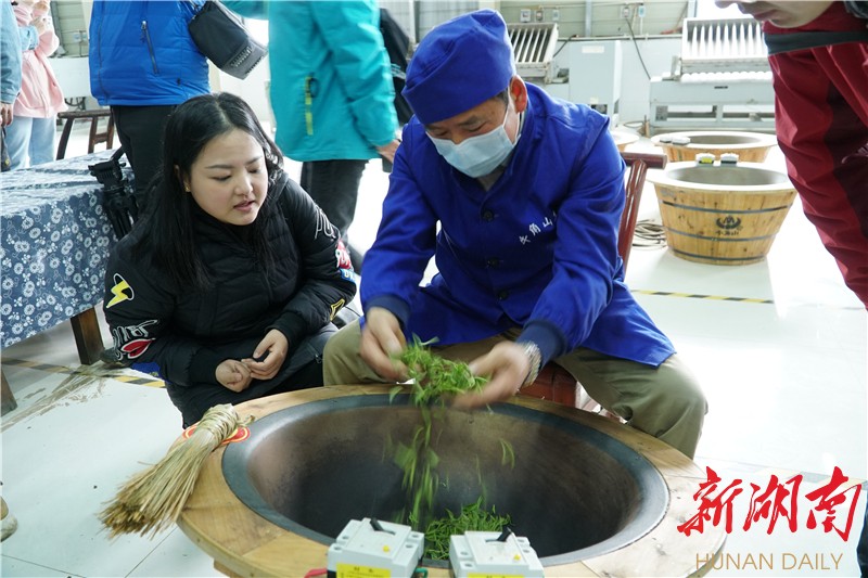 “炒茶过程中,要让茶叶散开,均匀受热,边炒边揉,把水分炒干。”车间里,炒茶师一边示范一边讲解,不同时段采的茶,含水量都不一样,炒制方法也不一样,全凭手感,需要丰富经验。同学们也学得有模有样,遇到不懂的地方,便虚心向炒茶师请教。不一会儿,整个车间都弥漫出一股淡淡的茶香。