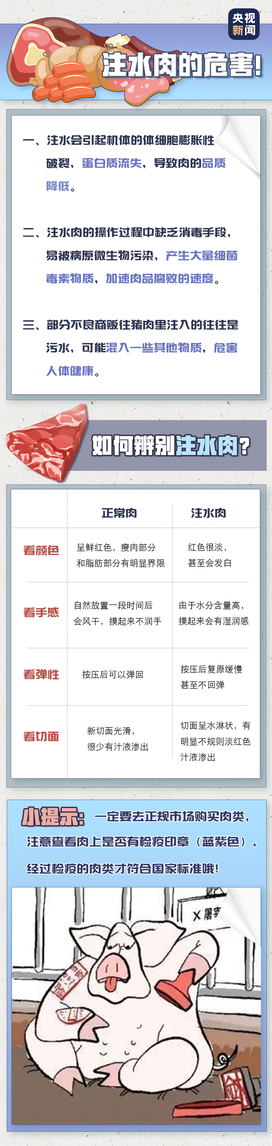 那么注水肉对人体都有哪些危害?我们平时买肉又该如何分辨?敲黑板画重点↓↓