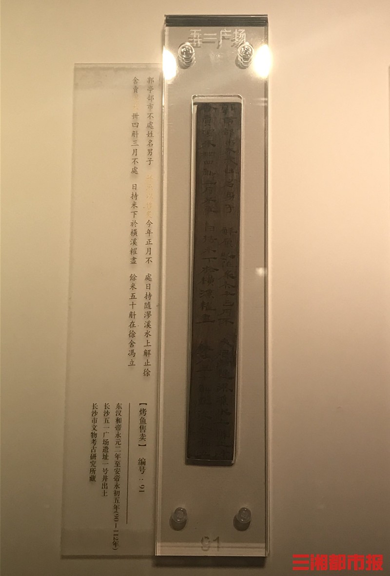 长沙五一广场遗址一号井出土 的“烤鱼售卖”木两行,提到郭亭部市场上有个不知道姓名的男子制作烤鱼。今年正月的某一天,他顺着漻溪水往上游,在一个叫徐的家里休息,卖烤鱼换得四十四斛米。三月的某一天,又带着米去了横溪下游,卖光了剩下的五十斛米。