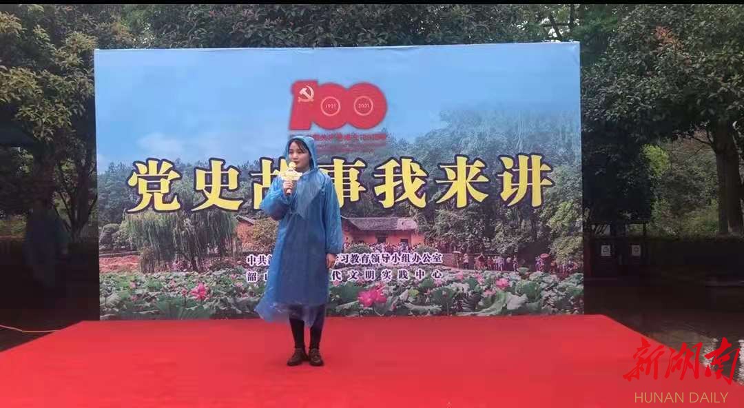 位于毛泽东广场入口处,韶山市新时代文明实践中心的“党史故事我来讲”志愿服务岗被围得里三层外三层,来自韶山市委党校的青年党员志愿者彭婕姝《江山就是人民,人民就是江山》的党史故事,讲述着共产党人全心全意为人民的初心,得到现场游客的一致叫好。