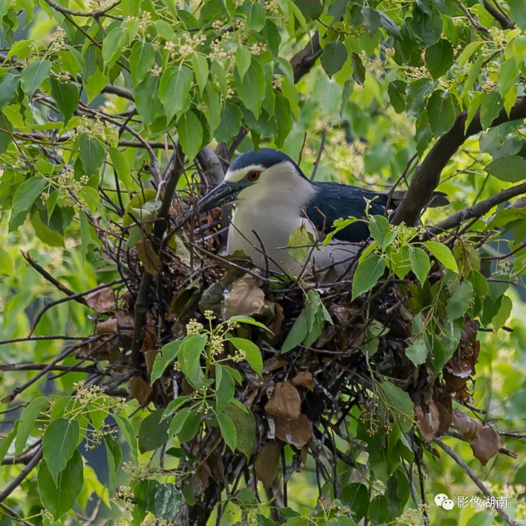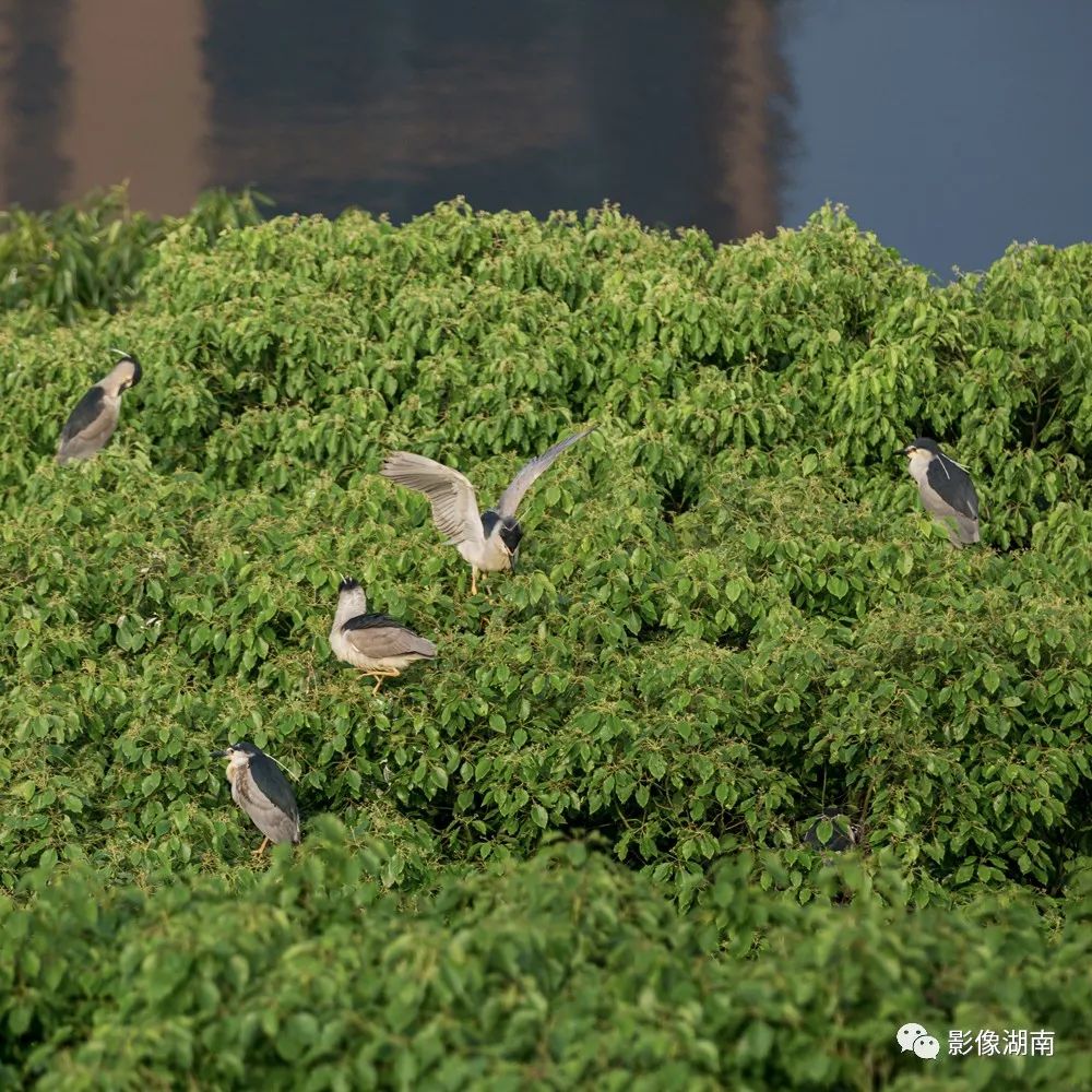 这片乐园里还有一类鹭种——夜鹭。这一类鹭翅及尾成羽灰色,它们常成小群于晨、昏和夜间活动,白天就结群隐藏于密林中僻静处。在枝叶密布的香樟大树上,只有仔细寻找,你才能一睹它们的芳容。