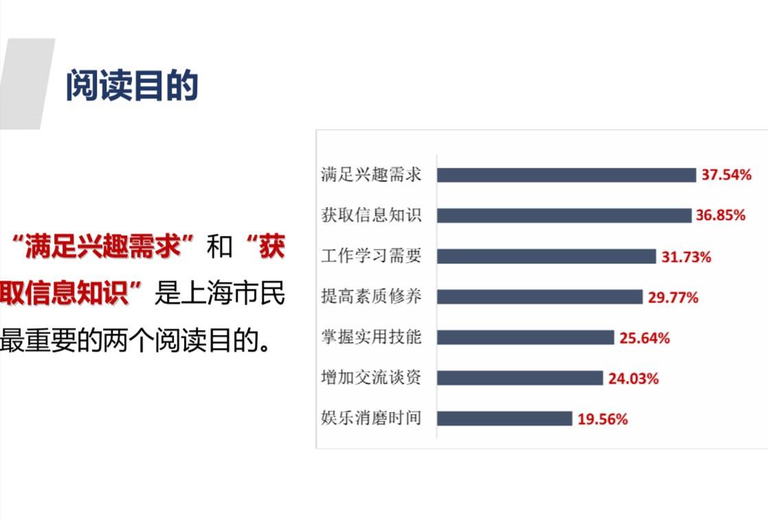 上海市民选择阅读的目的最重要的是满足兴趣需求,其他依次是获取知识信息、提高素质修养、工作学习需要、掌握实用技能、和增加交流谈资。