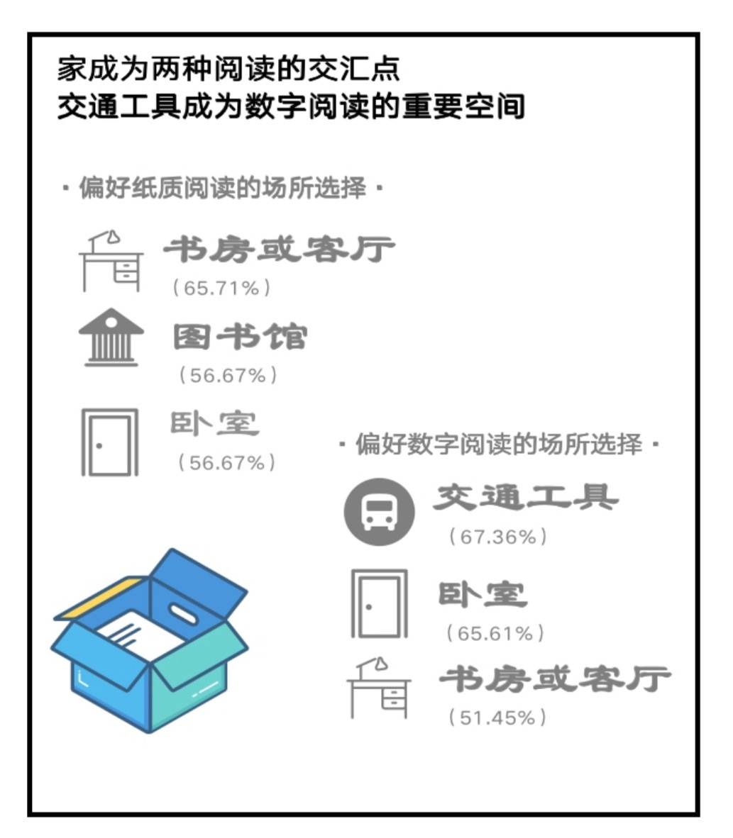 调查数据显示,家庭是市民阅读较为重要的场所,在不同阅读场所的选择上,“书房或客厅”“卧室”的占比均位 列前三位。传统纸质阅读的群体中,书房或客厅(65.71%)的选择排在第一位。