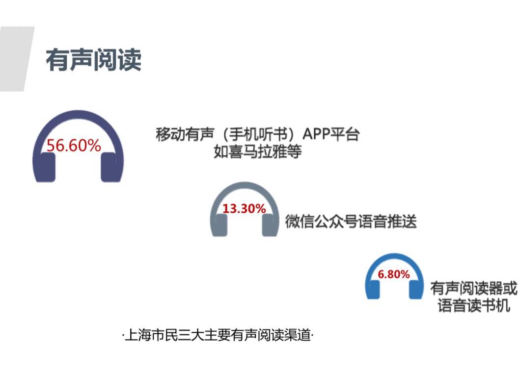 而市民进行有声阅读的主要渠道为移动有声(手机听书)APP 平台,占比为56.60%,微信公众号语音推送成为市民的第二选 择, 占比为13.30%。有声阅读器或语音读书机的占比为 6.8%。