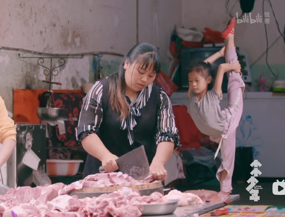 Outside the stall, her mom was busy chopping pork while the girl immerses herself in her dance. This is part of a documentary Little Giants made by Bilibili, a video-sharing site.
