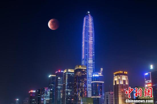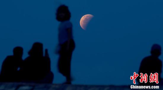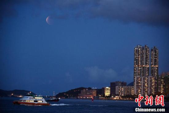 5月26日傍晚,香港市民在黄埔海滨观赏“超级月全食” ,食甚期间月亮呈现暗红色,吸引大量市民前来欣赏。图为“超级满月”升至半空。 中新社记者 李志华 摄