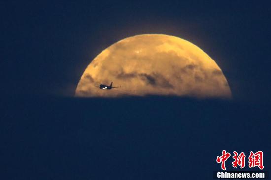 美国加州圣塔莫尼卡海滩,一架飞机和“超级血色月全食”同框。
