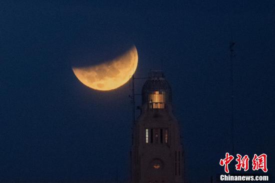 乌拉圭蒙得维的亚港,“超级血色月全食”亮相天宇。