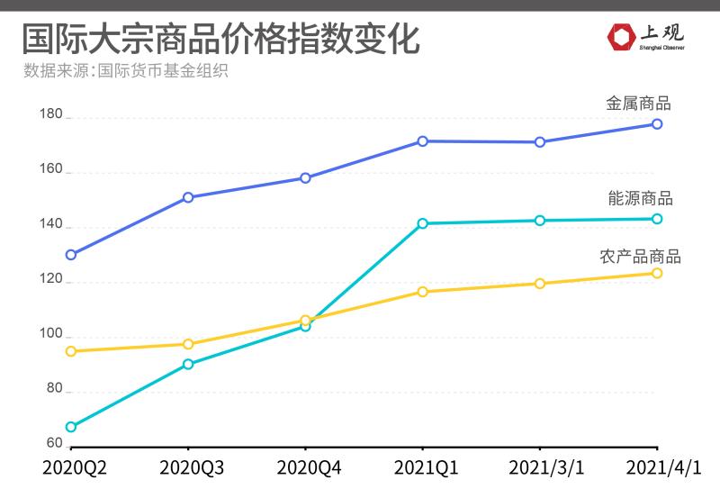 今年以来,国际大宗商品价格持续上涨,且部分商品价格连创新高。据国际货币基金组织(IMF)大宗商品价格指数显示,2020年4月至2021年2月,全部商品指数上涨了67%,其中能源指数涨172%、原油指数涨170%。