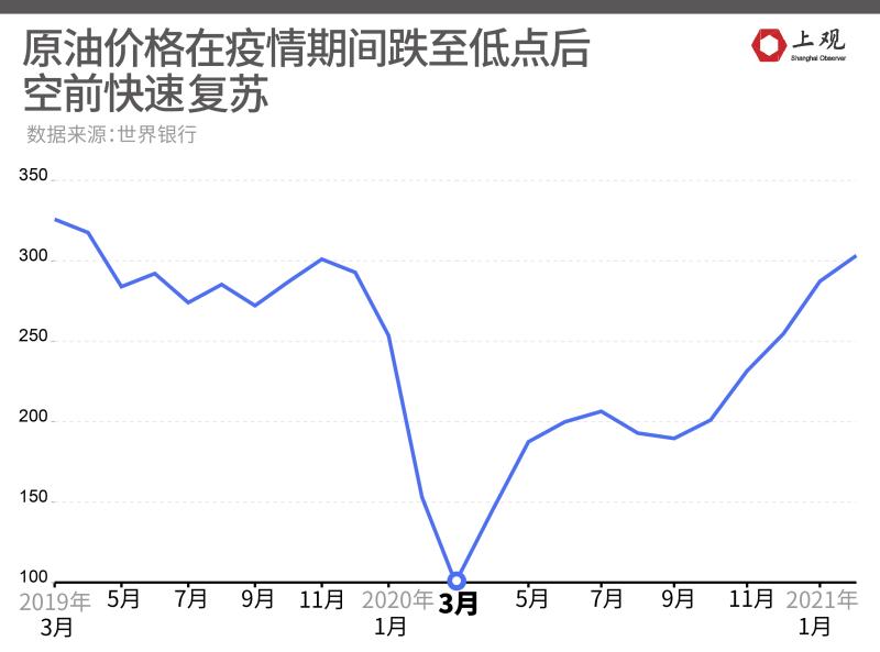 与之相似的,是疫情之后原油价格的变化。原油价格在2020年3月跌至最低点,而以此为基准,原油价格出现两次复苏,特别是在今年年初后,原油价格快速攀升,已接近疫情之前的水平。