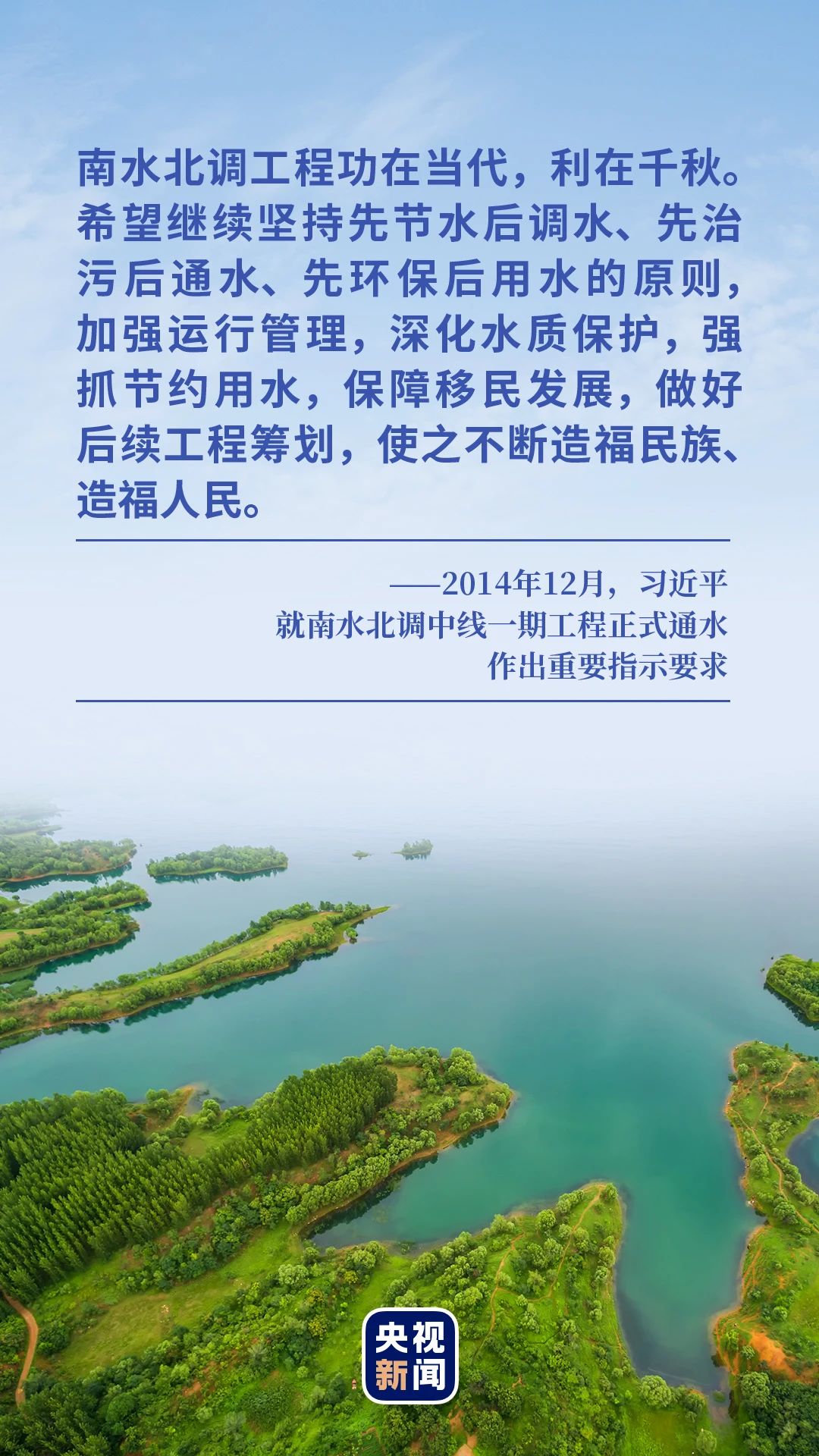 “南水北调中线一期工程正式通水,沿线40多万人移民搬迁,为这个工程作出了无私奉献,我们要向他们表示敬意,希望他们在新的家园生活幸福。”2015年新年到来之际,习近平总书记亲切的问候与祝福,温暖着每一个人。