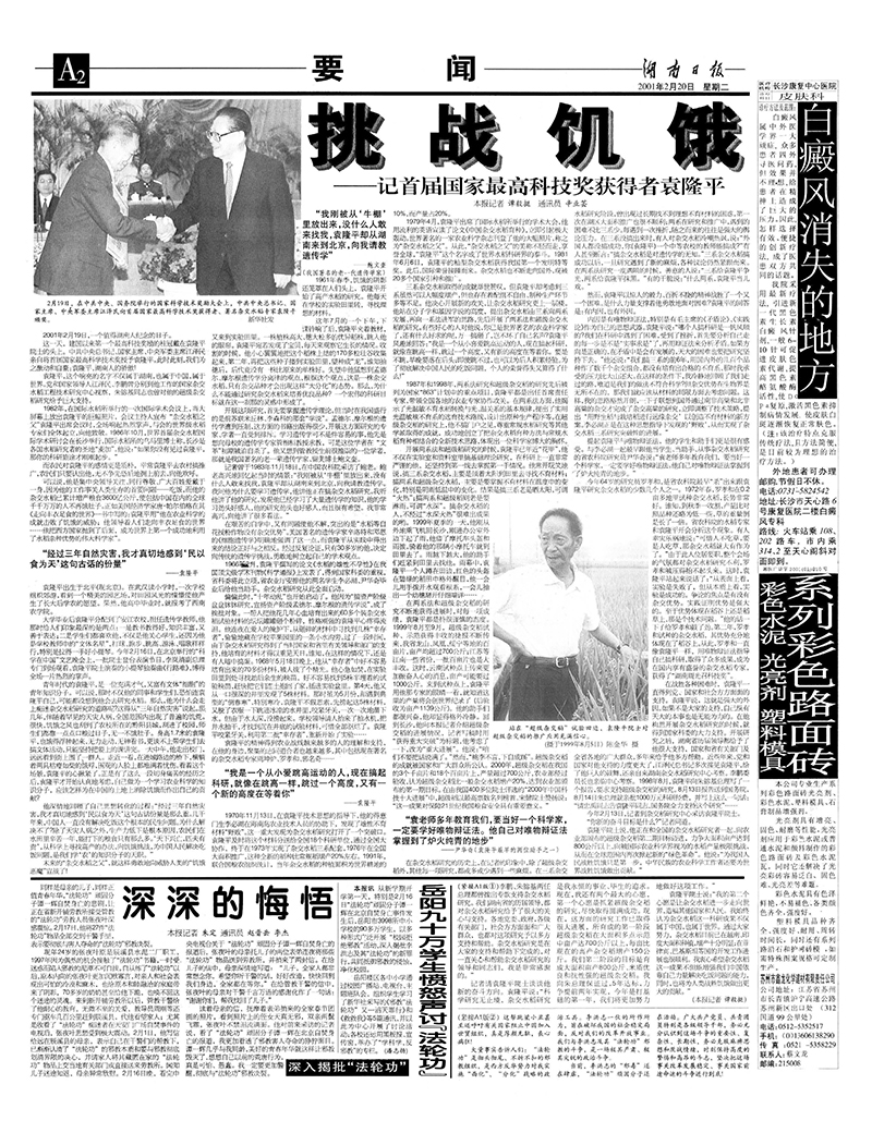 袁隆平,这个响亮的名字不仅属于湖南,也属于中国,属于世界。党和国家领导人江泽民、李鹏曾分别到他工作的国家杂交水稻工程技术研究中心视察,朱镕基同志也曾对他的超级杂交稻研究给予巨大支持。