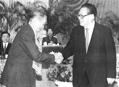 2月19日,在中共中央、国务院举行的国家科学技术奖励大会上,中共中央总书记、国家主席、中央军委主席江泽民向首届国家最高科学技术奖获得者、著名杂交水稻专家袁隆平颁奖。 新华社发