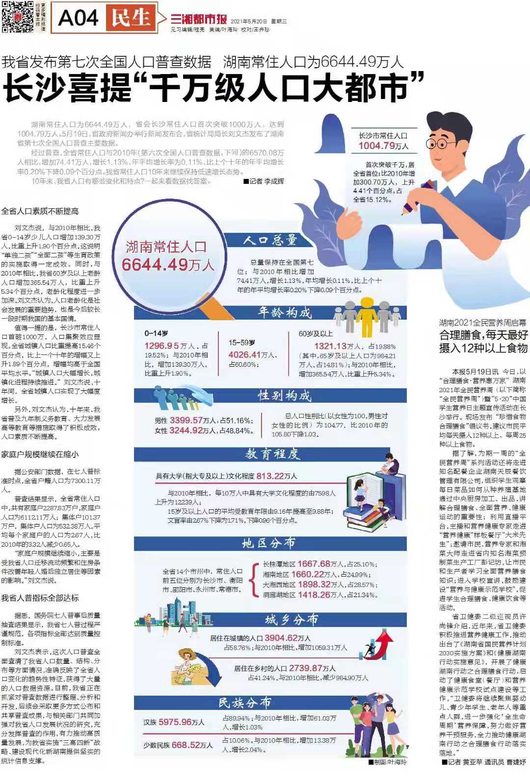湖南常住人口6644.49万人,长沙首次突破1000万人。