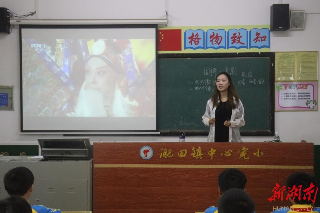 仪式结束后,潘仕雅老师通过一堂《国粹·京剧》课给学生们带去了欢乐和知识。上课前,为了更快的与孩子们拉近距离、融入他们,潘老师跟孩子们一起合唱了一首《没有共产党就没有新中国》,孩子们脸上局促不安的表情一下就变得开朗起来。课堂上,老师加强与学生的互动交流,引导学生认识京剧、了解京剧、欣赏京剧,培养学生的音乐审美能力。