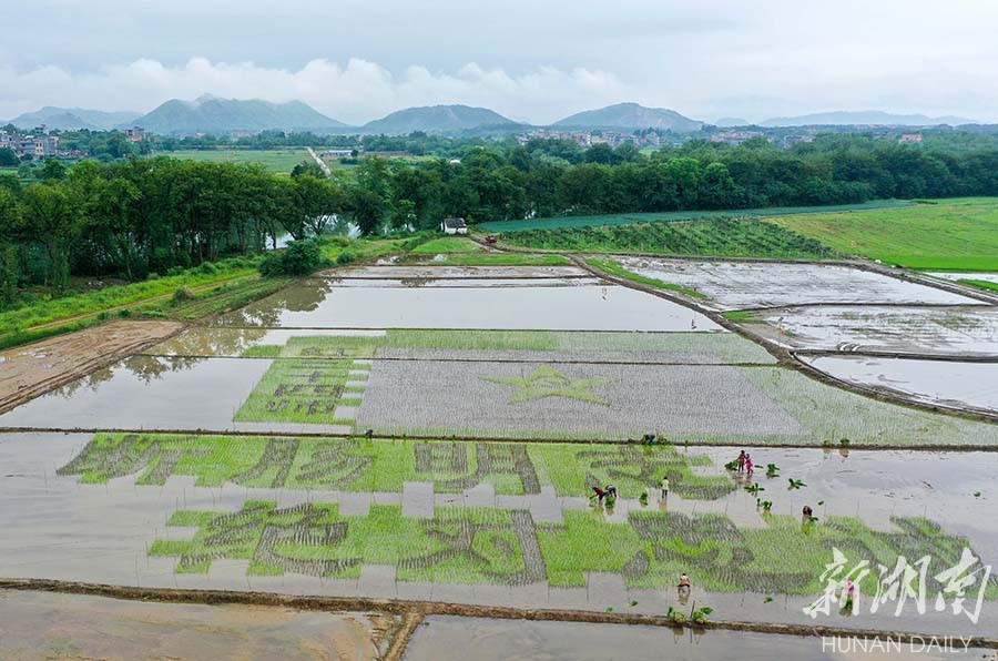 5月18日,道县梅花镇贵头村,村民在彩稻田里抢插秧苗。该村是何宝珍烈士故里、陈树湘烈士纪念园所在地、湖南省美丽乡村建设示范村。近年,贵头村进一步加强村庄人居环境治理,通过使用不同颜色的水稻“着色”,栽“种”红色文化相关图案和字样,成为助推红色旅游的新卖点。蒋克青 何红福 摄影报道