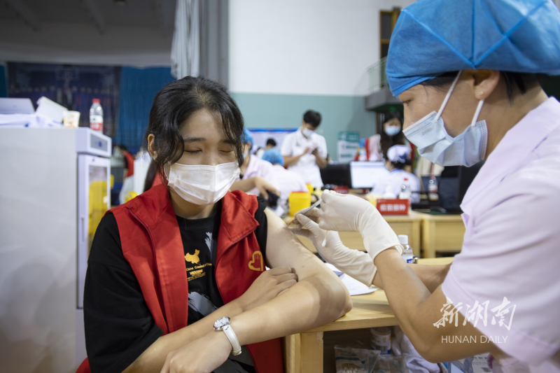 5月17日,中南大学本部体育馆内,学生在有序接种新冠病毒疫苗。按照国家的统一部署,我省自5月开始开展大规模人群接种工作,截至5月15日,全省累计报告接种新冠病毒疫苗1013万剂次,单日接种最高达到60余万人次。湖南日报·新湖南客户端记者 辜鹏博 张春祥 摄影报道