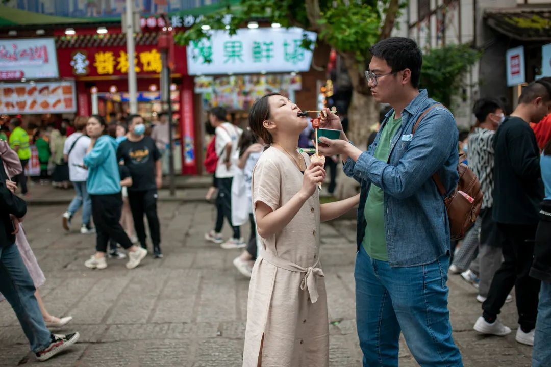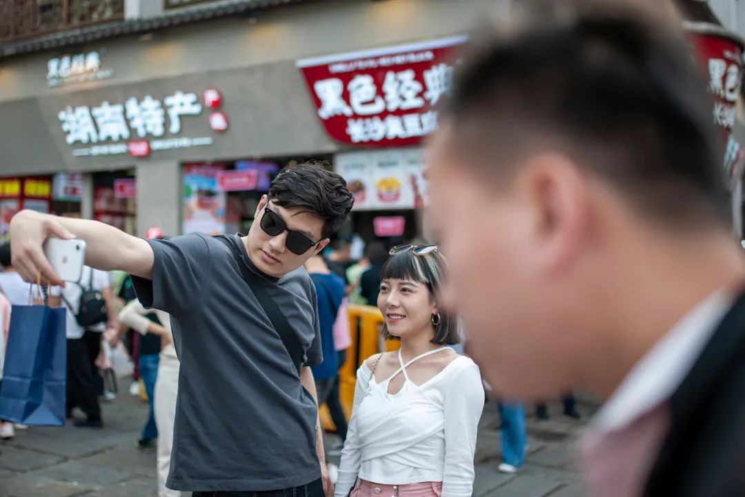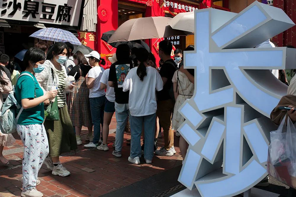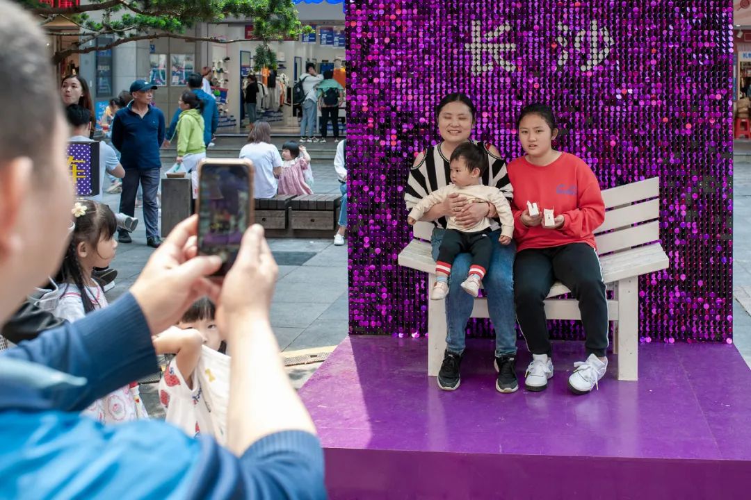 5月1日,湖南米粉街,市民在网红打卡点排队拍照。湖南日报·新湖南客户端 记者 辜鹏博 摄